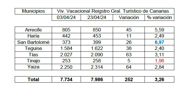 Exactamente el día 3 abril de este mismo año existían un total de 7.734 viviendas que tenían una orientación vacacional en toda la isla. De estas más de 7.700 casas, la gran mayoría se ubican en tres núcleos poblacionales: Yaiza, Tías y Teguise que por ese orden de importancia en el sector recogen el 75 % de viviendas vacacionales en toda la isla.