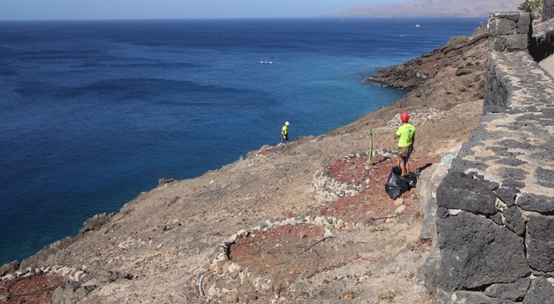 La zona acantilada de La Tiñosa, conocida como Risco Prieto, en dirección hacia el Barranco del Quíquere, ha sido limpiada de manera intensa en estos días. La Concejalía de Limpieza del Ayuntamiento de Tías, bajo la dirección del concejal Francisco Javier Aparicio Betancort, ha suscrito un acuerdo de colaboración con Emerlan para que el cuerpo de escaladores de esta ONG realizaran estas tareas de retirada de pequeños residuos esta zona rocosa de la costa de Puerto del Carmen.