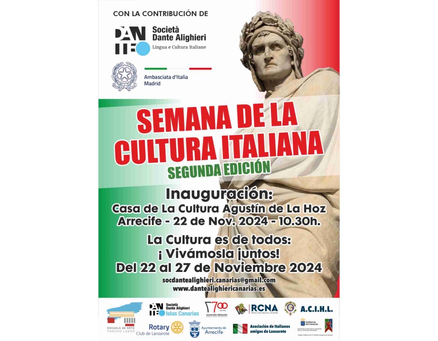 El viernes 22 de noviembre de 2024 comenzará la II edición de la Semana de la Cultura Italiana en Lanzarote, organizada por el Comité de las Islas Canarias de la Sociedad Dante Alighieri. Este prestigioso evento, dedicado a la promoción de la cultura y las tradiciones italianas, se llevará a cabo principalmente en la Casa de la Cultura "Agustín de La Hoz" en Arrecife y ofrecerá una amplia gama de actividades artísticas, históricas, musicales y científicas.