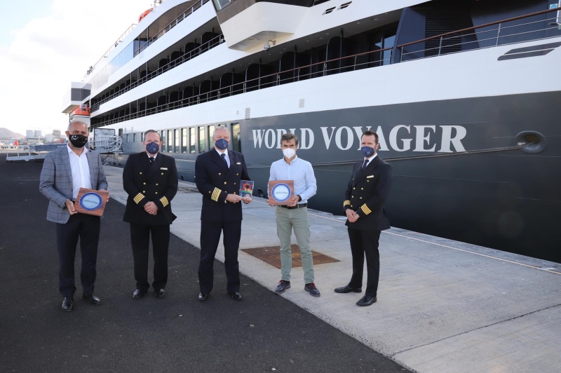 Lanzarote recibía esta mañana un crucero de gran lujo el 'World Voyager', una embarcación que viaja con más tripulación que pasajeros, que cuida cada detalle y que apuesta por minimizar la contaminación. El consejero delegado de la Sociedad de Promoción Exterior de Lanzarote (SPEL-Turismo Lanzarote), Héctor Fernández, fue el encargado de dar la bienvenida a pie de barco en el Muelle de Cruceros de Arrecife a Hans Soderholm, capitán del crucero, perteneciente a la compañía portuguesa Mystic Cruises, y consignado por Hamilton & Cía.