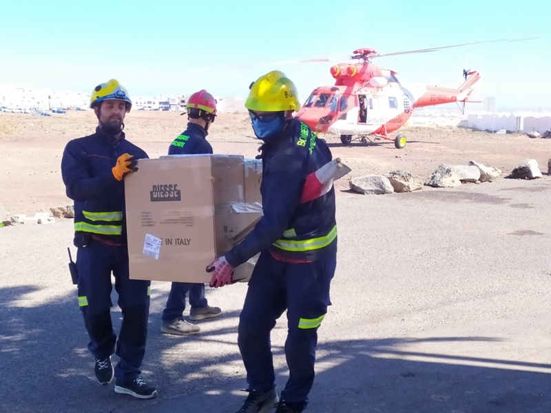 La presidenta del Cabildo, María Dolores Corujo, ha informado que en la tarde de hoy un helicóptero del Gobierno de Canarias ha entregado en el Consorcio de Seguridad y Emergencias un envío de mil kits para realizar análisis de detección del coronavirus, destinados al Hospital Doctor José Molina Orosa.