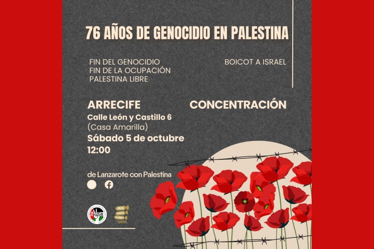 El grupo ciudadano de Lanzarote Por Palestina vuelve a convocar a la población para que exprese su exigencia del fin del genocidio en Gaza y Cisjordania, en una concentración que tendrá lugar el sábado 5 de octubre a las 12 horas frente a la Casa Amarilla, en Arrecife.
