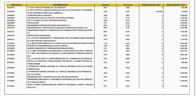 También se señala una inversión de 2’5 millones de euros para Pymes Canarias bajo el epígrafe destindo turístico sostenible, competitivo y seguro, tampoco especificadas.
