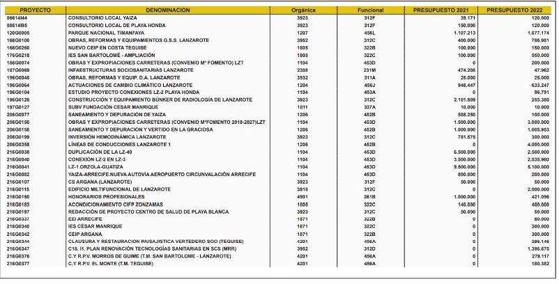 Una de las partidas más destacadas es la prevista para las obras de la carretera LZ-1 de Guatiza a Órzola, que está en fase de elaboración de proyecto, y que asciende a 5,1 millones de euros que se pinta para ejecutar en 2022, cantidad que algunos analistas creen que es imposible de ejecutar. En cualquier caso, se considera positivo que figure esa obra de cara al futuro.