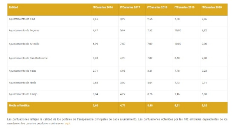 Lanzarote ha mejorado claramente en transparencia. En efecto, tras cinco años de evaluación, los ayuntamientos conejeros alcanzaron por primera vez una nota media de sobresaliente, con un 9,02, superando el notable alto del año anterior en el Índice de Transparencia de Canarias (#ITCanarias), que cada año elabora el Comisionado de Transparencia de Canarias. Los ayuntamientos de Tías, Teguise y Arrecife se aproximaron mucho al 10. De hecho, tan sólo Tinajo y Haría bajan del 9, y todos los municipios han mejorado notablemente en los últimos años.