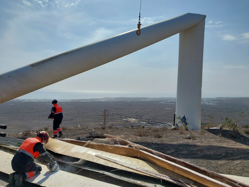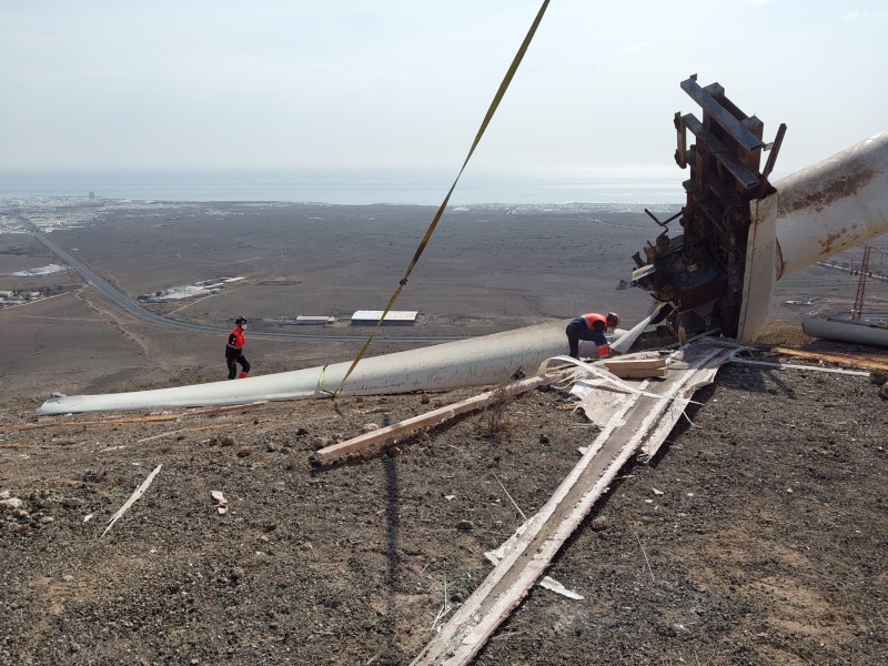 El Consorcio de Seguridad y Emergencias, a petición de Endesa, ha podido solucionar temporalmente el problema producido con la rotura de uno de los molinos de Montaña Mina y lo ha hecho al quitar las palas, cortarlas a la medida solicitada y apilarlas en un lugar seguro, dada la peligrosidad que revestían.