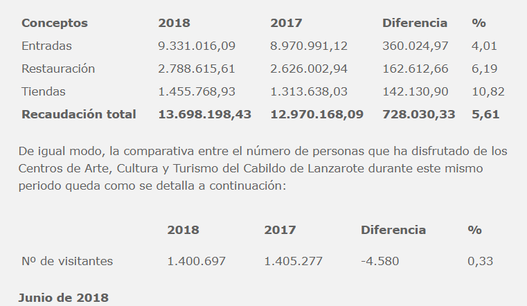 Los Centros de Arte, Cultura y Turismo han mantenido su compromiso con el crecimiento rentable y sostenible durante el primer semestre del presente ejercicio 2018, en el que han logrado recaudar 13.698.198,43 euros, un 5,61% más que en el mismo periodo del pasado año, con un descenso del 0,33% en el número de visitantes. Se dice que una empresa es sostenible cuando crea valor económico, medioambiental y social a corto y largo plazo para favorecer el bienestar y el progreso de la comunidad con la que interactúa. El consejero de los Centros, Echedey Eugenio, considera que los resultados cosechados por la Entidad este primer semestre del año se sustentan en una gestión asociada a "la toma valiente y transparente de decisiones, a la definición clara de los objetivos y a la apuesta firme que hemos realizado por la innovación y el fomento del talento, sin que ello haya supuesto un aumento del consumo de los recursos".