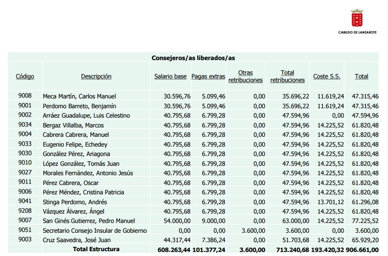 En total, de los 145 millones de euros a los que ascienden las cuentas, 906.661 euros se destinan a los sueldos del presidente del Cabildo y de los consejeros liberados tanto del grupo de gobierno como de la oposición oscilando entre los 47.315 euros que perciben en bruto anualmente los ediles liberados a tiempo parcial y los 77.225,52 euros que recibe Pedro San Ginés. De esta cantidad, concretamente 218.271 euros van a parar a los portavoces de PP, Podemos, Ciudadanos y Somos. No se incluye a Juan Manuel Sosa, de Nueva Canarias, pues él está liberado por Sanidad, de forma que percibe su sueldo del Servicio Canario de Salud y no del Cabildo.