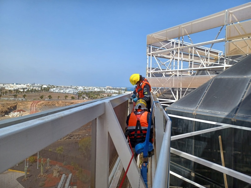 Se comprobó que se habían desprendido varios paneles de aluminio de gran tamaño del muro de cortina, provocando la rotura de dos cristales, a bastante altura y con un alto riesgo debido a las fuertes rachas de viento. Se procedió a asegurar los paneles mediante tornillos y eslingas y se retiró el cristal.