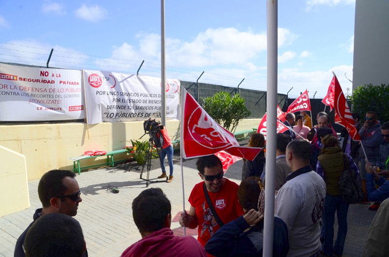 Los funcionarios del Centro Penitenciario de Tahíche se manifestaban hoy frente a estas instalaciones para mostrar su rechazo a la privatización exterior de las cárceles, medida que consideran contraproducente, y para pedir que se cree empleo público.