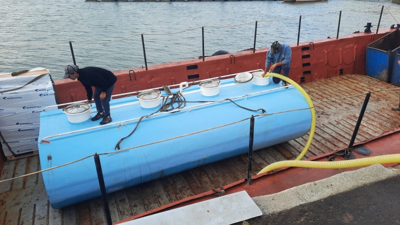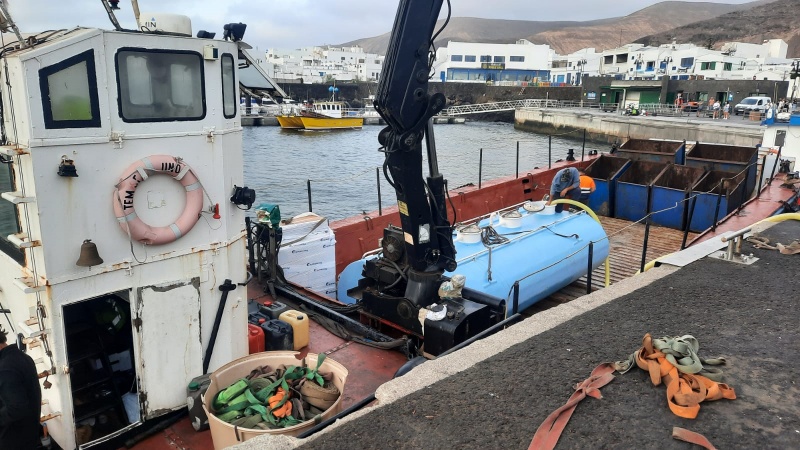 En las imágenes se puede ver la cuba que se ha trasladado a primera hora de la mañana para recargar la cuba que se subió el lunes por la tarde, vacía, ya que no se podía subir al muelle llena. Esta cuba se traslada llena a Órzola para ir rellenando la principal, en varios viajes.