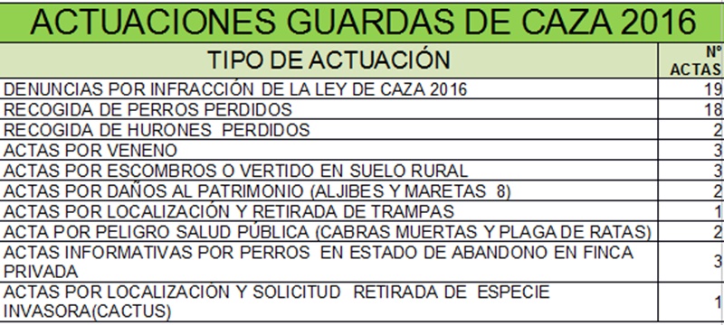 Su acción no se limitó a las denuncias, sino que además se levantaron 15 actas por diferentes motivos, que iban desde el uso ilegal de veneno en el suelo rural, la localización y solicitud de retirada de especies invasoras como puede ser el cactus espinoso arbóreo que afecta a la flora endémica y causa daños físicos a los perros que a él se aproximan, la localización de vertidos y residuos ilegales en el campo o el informe de la situación de estado de abandono casi una decena de aljibes y maretas. También localizaron y retiraron trampas que ponían en peligro a numerosas especies protegidas e informaron a las autoridades competentes de la localización depósitos de animales muertos que constituían un foco de infección que atentaba contra la salud pública.