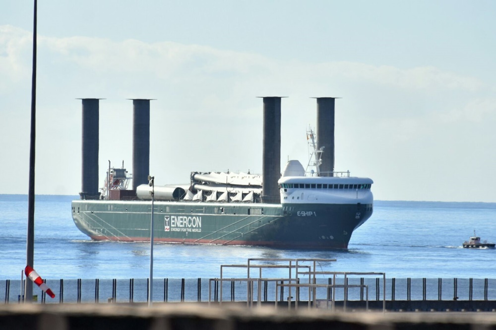 Parte de la inversión de los 16 millones de euros para el nuevo parque eólico de Lanzarote, ya se puede ver en el Muelle de Los Mármoles, después de que esta mañana arribara en la capital el barco de la empresa alemana Enercon, que se mueve solo también con energías limpias. El barco partió del puerto de Emden, en Alemania, con destino Viana, en Portugal donde hizo una parada, hasta tomar rumbo a Lanzarote.