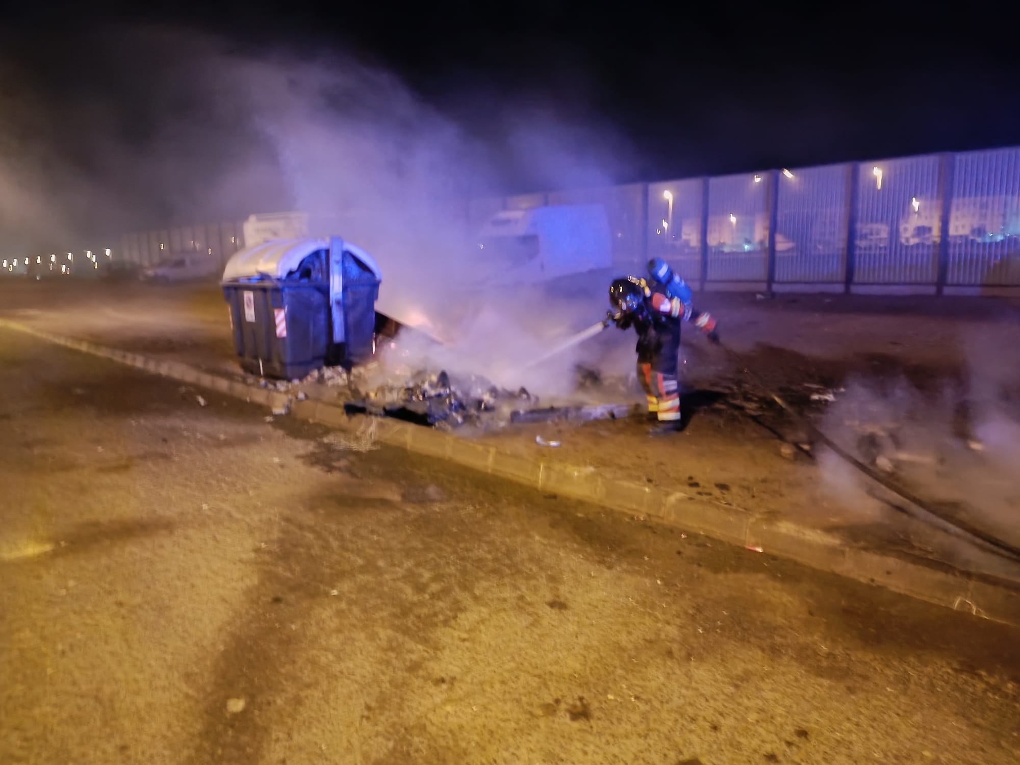 A las tres de la madrugada los Bomberos recibían la primera alarma en una noche que iba a ser especialmente movida. En este primer caso, el fuego afectaba a tres contenedores de basura orgánica, un contenedor de plástico y tres vehículos, con diferente nivel de daño provocado por la radiación. Se sofocó el fuego con agua pulverizada y a chorro.