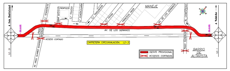 Así lo han anunciado desde el Ayuntamiento arrecifeño, detallando que desde ahora, la circulación vehicular se traslada a la avenida de Los Geranios en Maneje y a la calle Iguadén en el Plan Parcial Los Geranios, mientras que también quedará cerrado el paso bajo la Circunvalación que comunica la calle Tenderete con la calle Hermanos Álvarez Quintero, ante lo cual habrá un desvío alternativo por la calle Iguazú hacia la LZ-20 y la salida desde Titerroy será también hacia la LZ-20, según se informó desde el Consistorio capitalino.