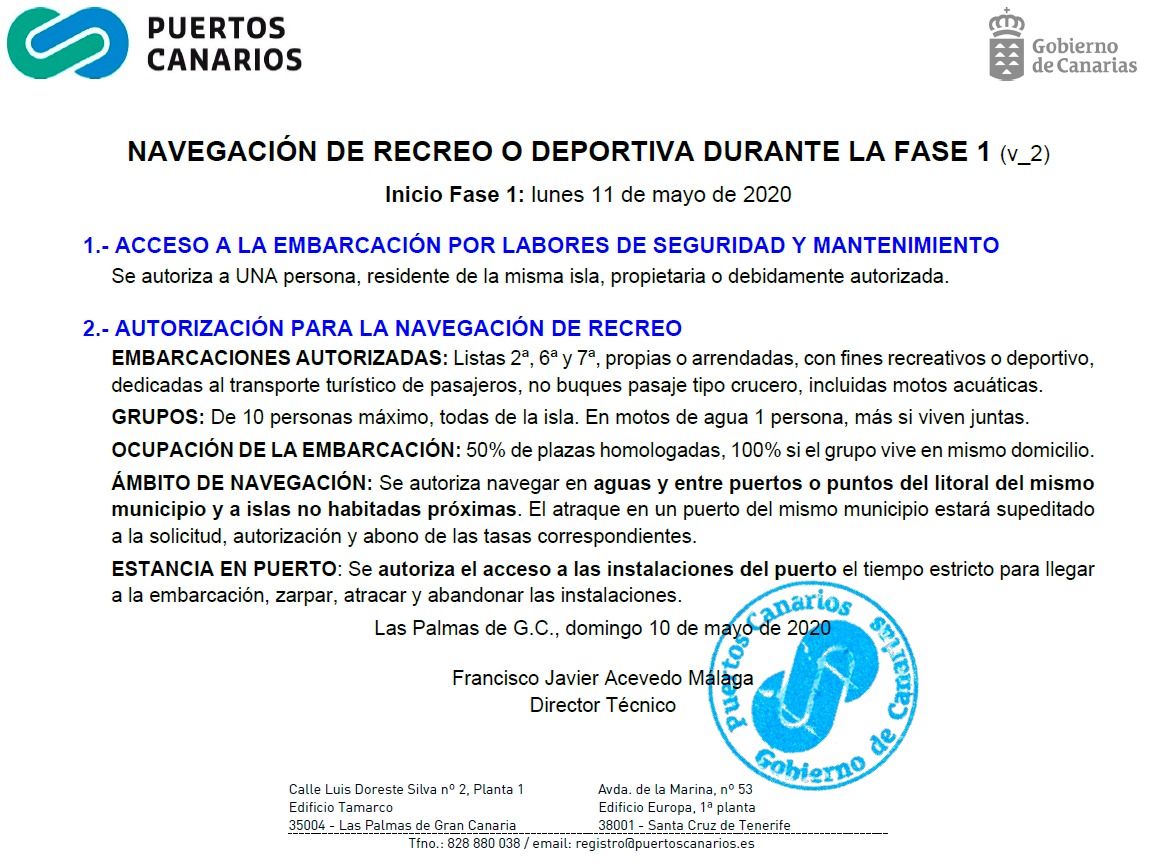 Puertos Canarios ha informado sobre las condiciones que hay que cumplir a partir de este lunes, día que Canarias alcanza la Fase 1, para acceder a embarcaciones por labores de seguridad y mantenimiento o para navegar como actividad de recreo.