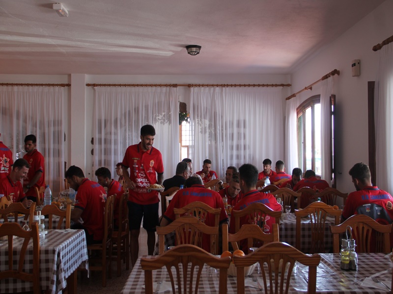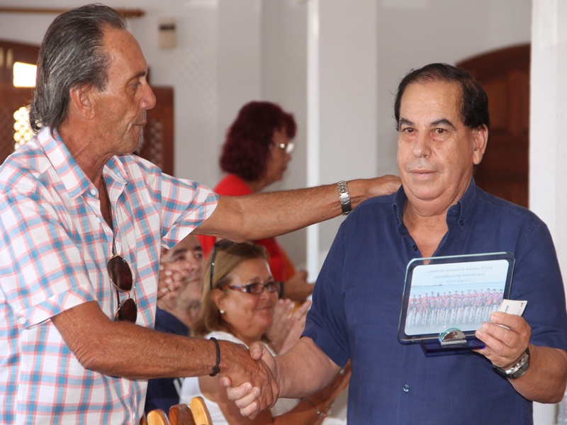 Durante el almuerzo, Domingo Gil realizó la entrega de unos abonos y una placa a Juan, propietario del restaurante, como agradecimiento por el trato recibido por la delegación rojilla que año a año se desplaza hasta Mancha Blanca por estas fechas.