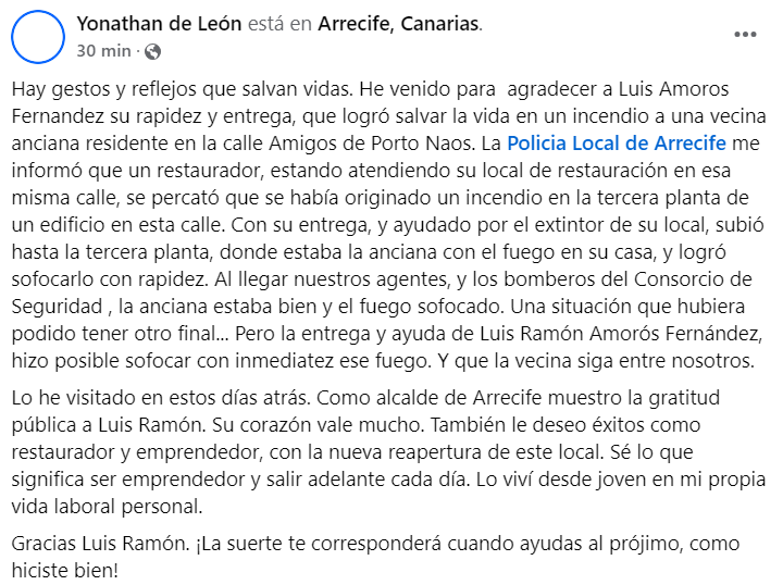 Según relata el alcalde de Arrecife, Yonathan de León, "La Policia Local de Arrecife me informó que un restaurador, estando atendiendo su local de restauración en esa misma calle, se percató que se había originado un incendio en la tercera planta de un edificio en esta calle. Con su entrega, y ayudado por el extintor de su local, subió hasta la tercera planta, donde estaba la anciana con el fuego en su casa, y logró sofocarlo con rapidez.