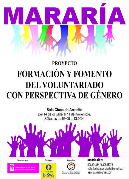 La Asociación social y cultural para las Mujeres Mararía llevará a cabo el sábado 11 de noviembre la clausura de su curso-taller de formación de voluntariado con perspectiva de género. Participarán en la entrega de diplomas la presidenta de la entidad, Nieves Rosa Hernández y la alcaldesa de Arrecife, Eva de Anta.