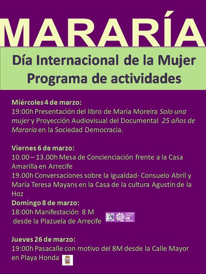 Con motivo del 25 aniversario de la asociación Mararía y la celebración del 8 de marzo, Día Internacional de la Mujer, la asociación social y cultural para las mujeres de Lanzarote, Mararía, reunirá a dos primeras espadas de la lucha feminista y contra la violencia de género en España. Se trata de la abogada especialista en problemática de la mujer y vicepresidenta de la Coordinadora de Organizaciones de Mujeres para la Participación y la Igualdad, Consuelo Abril y de la subdelegada del Gobierno en Las Palmas y prestigiosa psiquiatra de la Sanidad canaria, María Teresa Mayans.