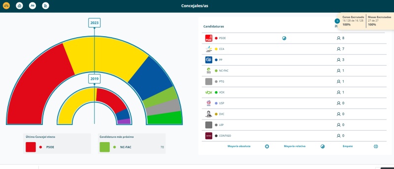 En cuanto al resto de resultados, el PP obtendría tres concejales, Nueva Canarias, un concejal, y el PTG y VOX, uno cada uno.
