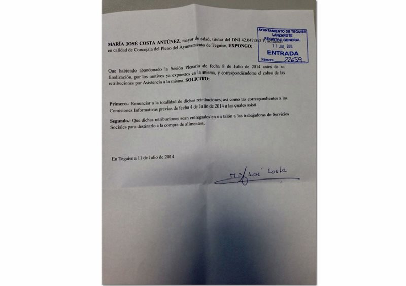 La concejal del PP en Teguise, María José Costa, ha renunciado a las dietas del pleno que abandonó el pasado martes, así como a las de las dos comisiones previas al mismo, y ha decidido ceder el dinero al área de Bienestar Social. Costa asegura además que, aunque apenas ha tenido tiempo para hablar con sus compañeros de partido, “estos harán lo mismo”.