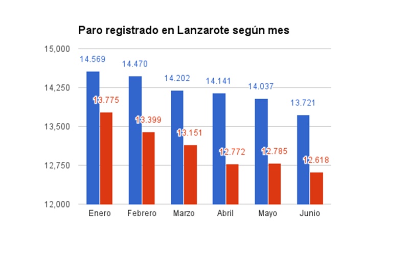 Un total de 1.103 personas salieron de las listas del paro en Lanzarote en en un año lo que supone un descenso del 8%. Y es que, según datos del Observatorio Canario de Empleo, junio se cerró con 12.618 parados en la isla frente a los 13.721 que había en el mismo mes del año pasado. Con respecto a mayo, hay 167 desempleados menos, un descenso del 1,3%.