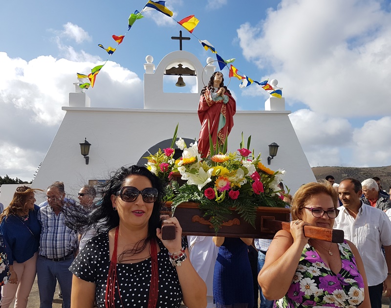 La localidad de Masdache celebró este sábado el Día de La Magdalena, la patrona de este pueblo vinícola junto al valle de La Geria. Cuatro vecinas de este pueblo del municipio de Tías han portado a sus hombros la imagen de María de Magdalena durante la procesión por la carretera de La Geria, que ha tenido lugar en la tarde del sábado.