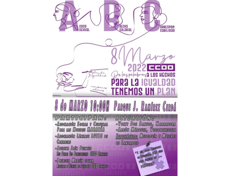 CCOO quiere manifestar que se unirán a los actos organizados por la Plataforma Feminista 8M y espera que la sociedad lanzaroteña se implique y acompañe a esta organización en los actos preparados para todo el mes de marzo, así como a la manifestación que tendrá lugar el 8 de marzo por la tarde.