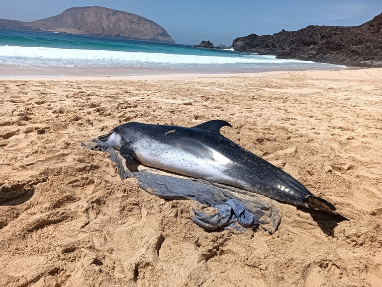 Tuvieron que sacrificar a un delfín varado en la playa de Las Conchas en La Graciosa. No sé pudo devolver al mar porque estaba en muy malas condiciones.