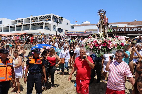 Alrededor de medio centenar de embarcaciones, entre pesqueras, de recreo e incluso los optimist y laser de la Escuela Municipal de Vela, esperaban en la bahía de Playa Blanca listos para recibir a la Patrona y acompañarle durante su recorrido marinero abordo del ‘Isla de Alegranza’, del pescador Samuel Cabrera Nieves, sin duda la mejor manera de mostrarle su devoción y rendirle un merecido tributo. Durante su paseo en barco, seguido por cientos de personas que abarrotaban el paseo marítimo y la pequeña playa del pueblo de Playa Blanca, la famosa banda grancanaria ha continuado poniendo ambiente en tierra con un repertorio mucho más festivo que ha entusiasmado a residentes y turistas.