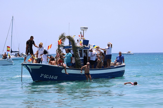 Cientos de personas han acudido este mediodía a la playa del pueblo de Paya Blanca para acompañar y mostrar su respeto, desde tierra y mar, a la patrona de los marineros y de la localidad turística durante su procesión marítima, acto que este año se ha encargado de despedir las fiestas y que ha contado con significativas novedades.