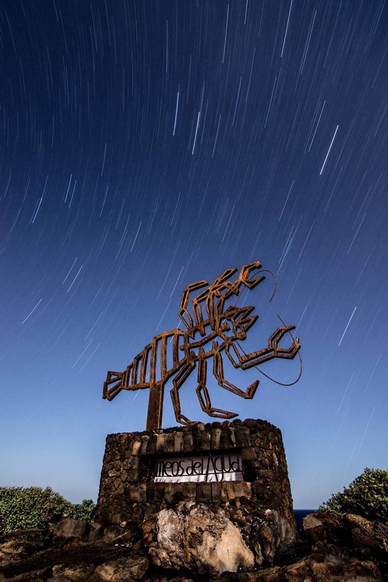 El fotógrafo utilizó la técnica de larga exposición para capturar esta imagen, aprovechando el movimiento terrestre para registrar el rastro estelar visible desde la Tierra. Según Méndez, su intención era retratar el cartel emblemático de la isla, obra del reconocido artista César Manrique, y plasmar el entorno de los Jameos del Agua, donde los cangrejos blancos luchan por sobrevivir.