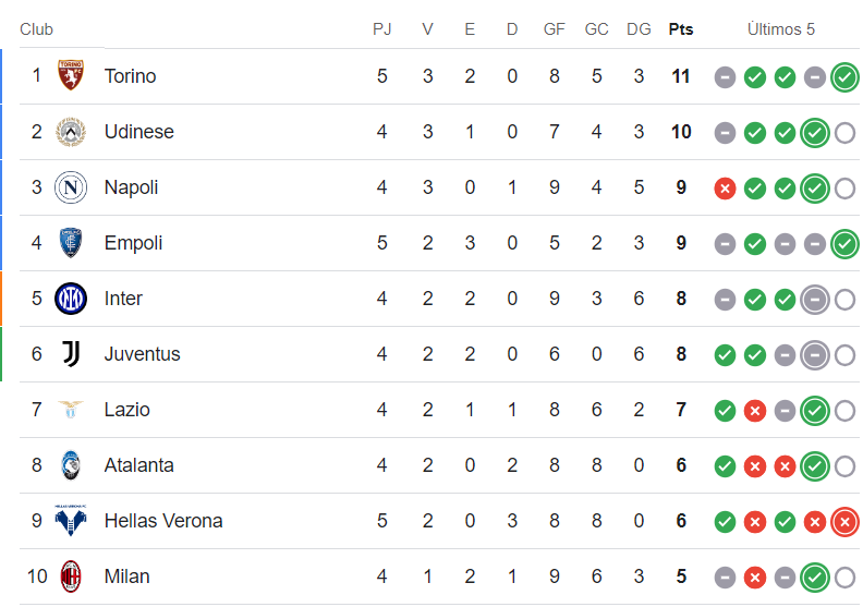 Sin embargo, tras una buena pretemporada y con la disputa ya de cinco partidos de la competición doméstica, el Torino de Saúl Coco se mantiene líder en solitario por delante de escuadras como Milan, Inter o Juventus. Aunque es cierto que tanto Udinese como Nápoles cuentan con un partido menos que disputarán hoy ante Roma y Juventus, respectivamente.