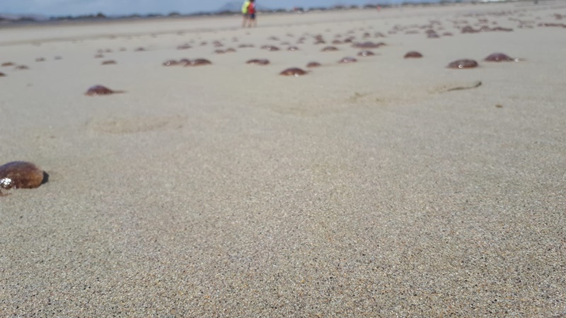 Las corrientes marinas dejan la orilla de la playa de Famara plagada de aguavivas comunes