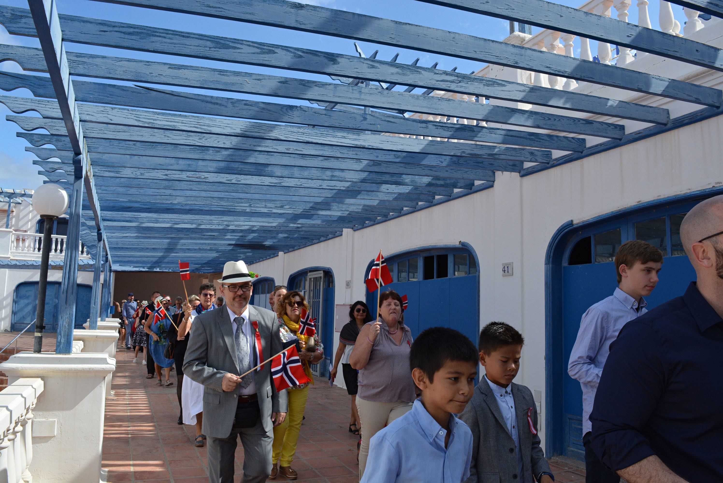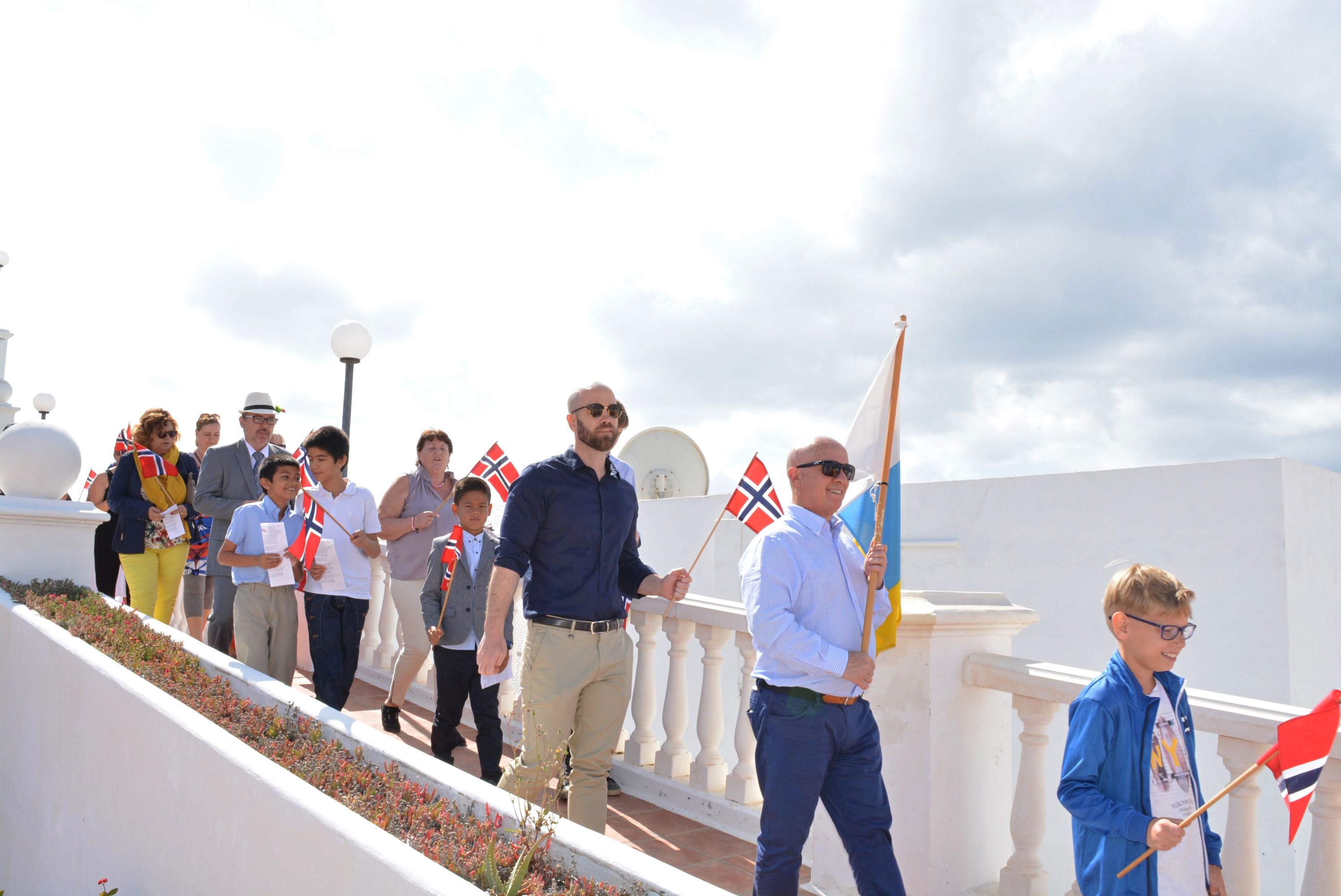 La Comunidad Noruega residente en Lanzarote ha festejado este jueves, 17 de mayo, el día grande de su país con un acto muy especial celebrado en Puerto del Carmen donde no han faltado las banderas noruegas, la música, el desfile y la gastronomía típica.