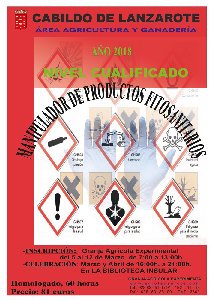 El Cabildo de Lanzarote, a través del Área de Agricultura y Ganadería que dirige el consejero Antonio Morales, organiza un curso de manipulador de productos fitosanitarios, nivel cualificado. Homologado por el Gobierno de Canarias y de 60 horas de duración, se celebrará los días 13, 14, 16, 20, 22, 23, 27 y 28 de marzo, así como 3, 4, 6, y 10 de abril, de 16:00 a 21:00 horas en el Salón de Actos de la Biblioteca Insular.