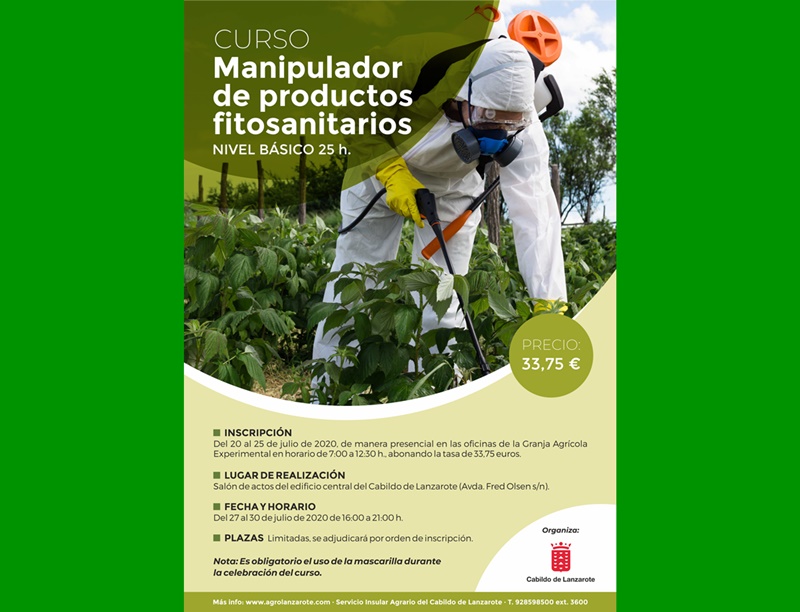 El Cabildo de Lanzarote, a través del Área de Agricultura y Ganadería que dirige el consejero Ángel Vázquez, celebrará un nuevo curso de manipulador de productos fitosanitarios, nivel básico, del 27 al 30 de julio, en horario de 16:00 a 21:00 horas en el Salón de Actos de la primera Corporación insular.