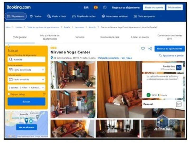 La investigación policial ha permitido constatar que "tras realizar búsqueda mediante técnicas "OSINT", se localiza en el portal de reservas de alojamiento "BOOKING" anuncio donde se publicita este local como oferta alojativa ..."