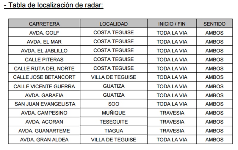 Por ahora, en Costa Teguise se han fijado cuatro puntos: Avenida del Golf, Avenida del mar, Avenida El Jablillo y Calle Piteras. En Teguise, los conductores que circulen por la calle José Betancort o por la Avenida Gran Aldea podrán encontrarse con un control de velocidad. También podrán hacerloaquellos que conduzcan por la calle Vicente Guerra y por la Avenida Garafía de Guatiza. El radar también podrá instalarse en la calle San Juan Evangelista de Soo, en la Avenida El Campesino de Muñique y en la Avenida Guanareme de Tiagua.