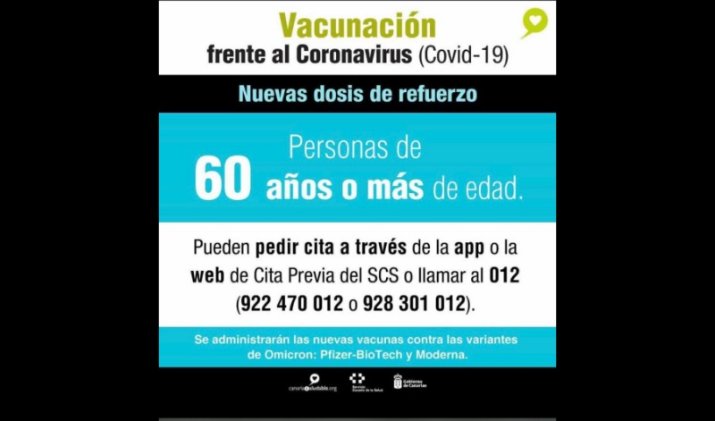 La Consejería de Sanidad del Gobierno de Canarias informa que desde hoy miércoles, 5 de octubre, se amplía la población diana a los mayores de 60 años para la administración de las nuevas vacunas adaptadas a las variantes de Omicron. El objetivo es que las personas mayores de 60 años reciban a partir de ahora la cuarta dosis, también denominada segunda dosis de refuerzo contra el coronavirus.