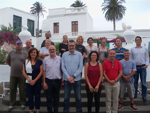 El alcalde de Haría, Marciano Acuña, acompañado por la concejal de Empleo, Soraya Brito, el concejal de Vías y Obras, Víctor Robayna, el primer teniente de alcalde, José Pérez, y la concejal de Centros Socioculturales, Yéssica Mesa recibieron en el salón del plenos del Consistorio a estos trabajadores que durante dos meses van a prestar sus servicios en el Municipio.