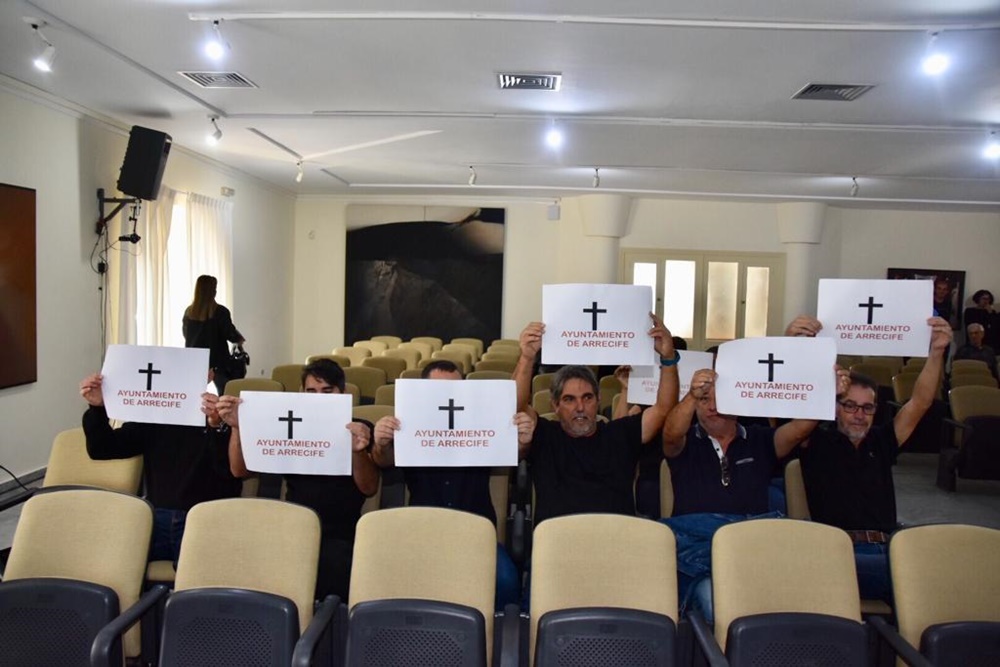 Coalición Canaria, PP y algunos trabajadores acudieron al salón de plenos vestidos de negro y con pancartas simulando esquelas