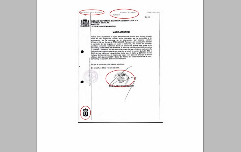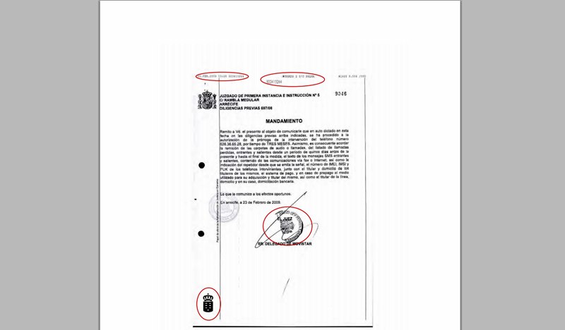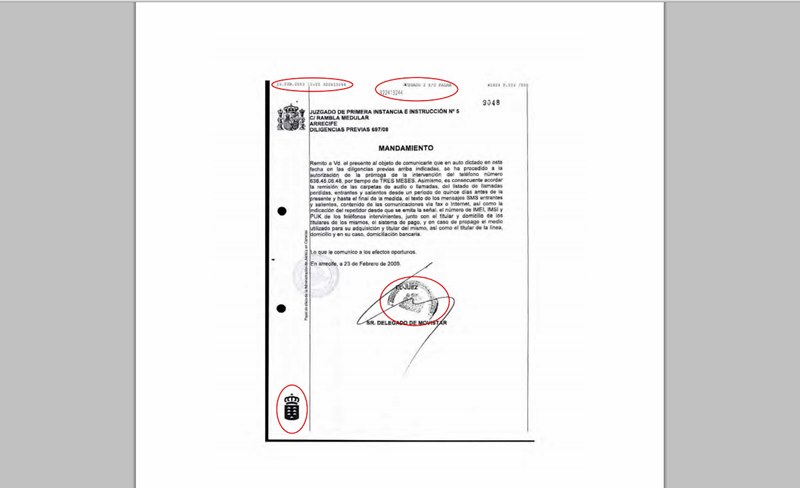 Allí, presuntamente, redactó los cuatro mandamientos judiciales para su envío a las compañías telefónicas a través de la UCO, remitiéndoselos por fax, ordenando prorrogar las escuchas. Los firma y estampa el sello judicial del Juzgado Mixto de La Palma, recortando la parte del sello que hacía referencia a La Palma, como demuestran los reportes de fax que figuran en la parte superior y que nadie se molesto en borrar.