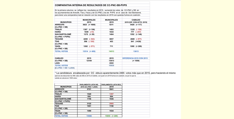 El presidente no quiere quitar méritos a nadie. “Claro que nada de lo que voy a diseccionar ahora resta un ápice al enorme mérito que tuvo la segunda mayoría absoluta consecutiva de Coalición Canaria en Teguise y, mucho menos, a la quinta en Tinajo. Ni que decir de los espectaculares resultados obtenidos en Arrecife, especialmente considerando la ola socialista que arrasó en todo el país y a la que Lanzarote no fue ajena, pero vamos a ello”, señala. “Por municipios, como dije Coalición Canaria solo creció en votos y porcentaje en Arrecife donde contamos con el respaldo de San Borondón (+2.265 votos). En Tinajo, incrementamos nuestros resultados en 106 votos aunque retrocedimos en un 3% de respaldo, y perdimos respaldo electoral en votos y porcentaje en otros cuatro municipios respecto a las elecciones de 2015”.