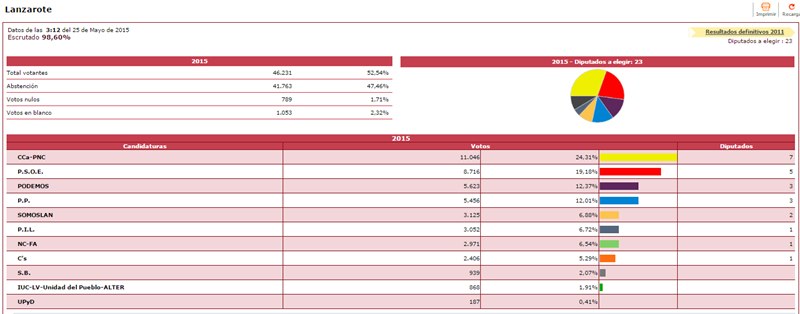 Somos Lanzarote, la plataforma donde se integra Alternativa Ciudadana, consigue dos consejeros, mientras el PIL cae y se queda con uno tras perder dos. También entran en la institución Nueva Canarias y Ciudadanos con un consejero cada uno.