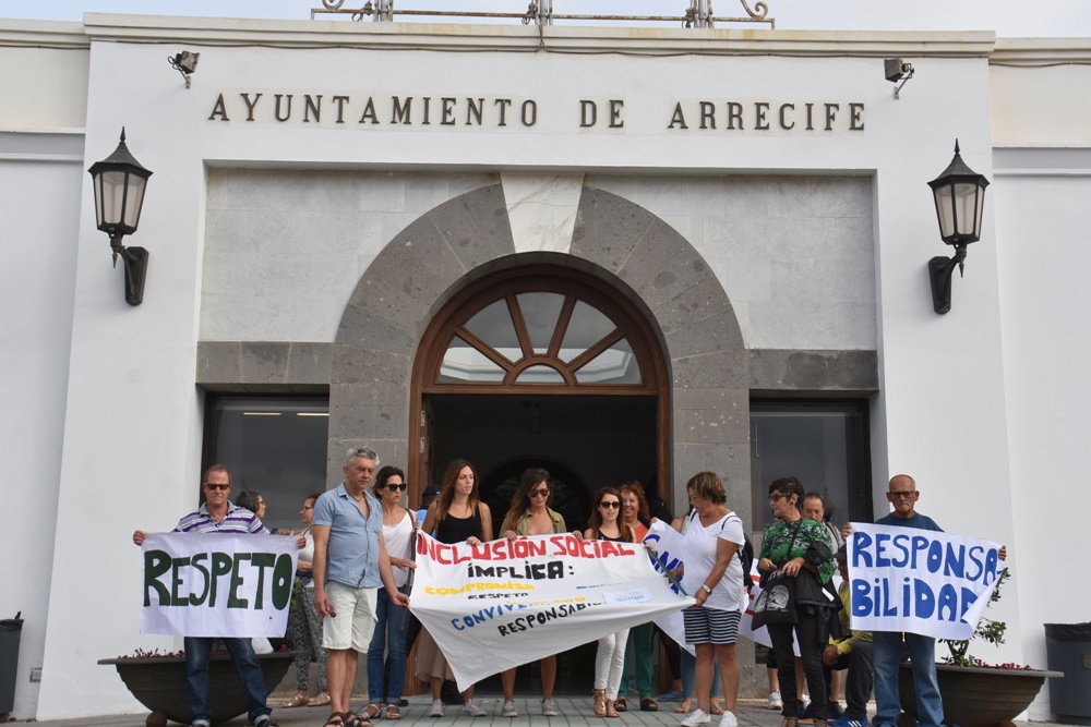La Fundación Canaria Flora Acoge se ha concentrado esta mañana a las puertas del Ayuntamiento de Arrecife en señal de protesta por las cantidades que se le adeudan del año 2018 que hacen que peligre la gestión de inclusión social que desarrolla la organización.