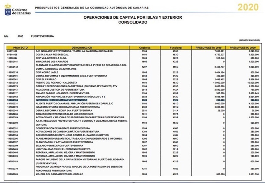 La parlamentaria popular Astrid Pérez ha aportado a la opinión pública la ficha de la partida presupuestaria del 2020 destinada a la creación de la Unidad de Hemodinámica en la isla de Fuerteventura. Por el contrario, tal y como ha denunciado esta semana la también presidenta insular del PP, el Pacto de las Flores ha dejado a la isla de Lanzarote sin financiación para poder abrir, durante el 2020, esta necesaria Unidad que salva vidas a las personas que puedan padecer un infarto en las islas de Lanzarote y La Graciosa.