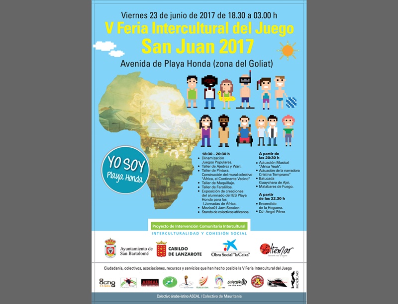 La V Feria Intercultural Juego-San Juan 2017, este año dedicada al continente vecino, África, se celebrará como viene siendo habitual el 23 de Junio en la Avenida de Playa Honda, coincidiendo con la noche más corta del año. La jornada que contará con dinamización infantil, talleres lúdicos, música en directo, exhibiciones y la quema de la Hoguera de San Juan concentrará a ciudadanía, profesionales, asociaciones y servicios que trabajan de forma colectiva en un proyecto que dinamiza el espacio público para promover la convivencia y la expresión del pluralismo cultural.