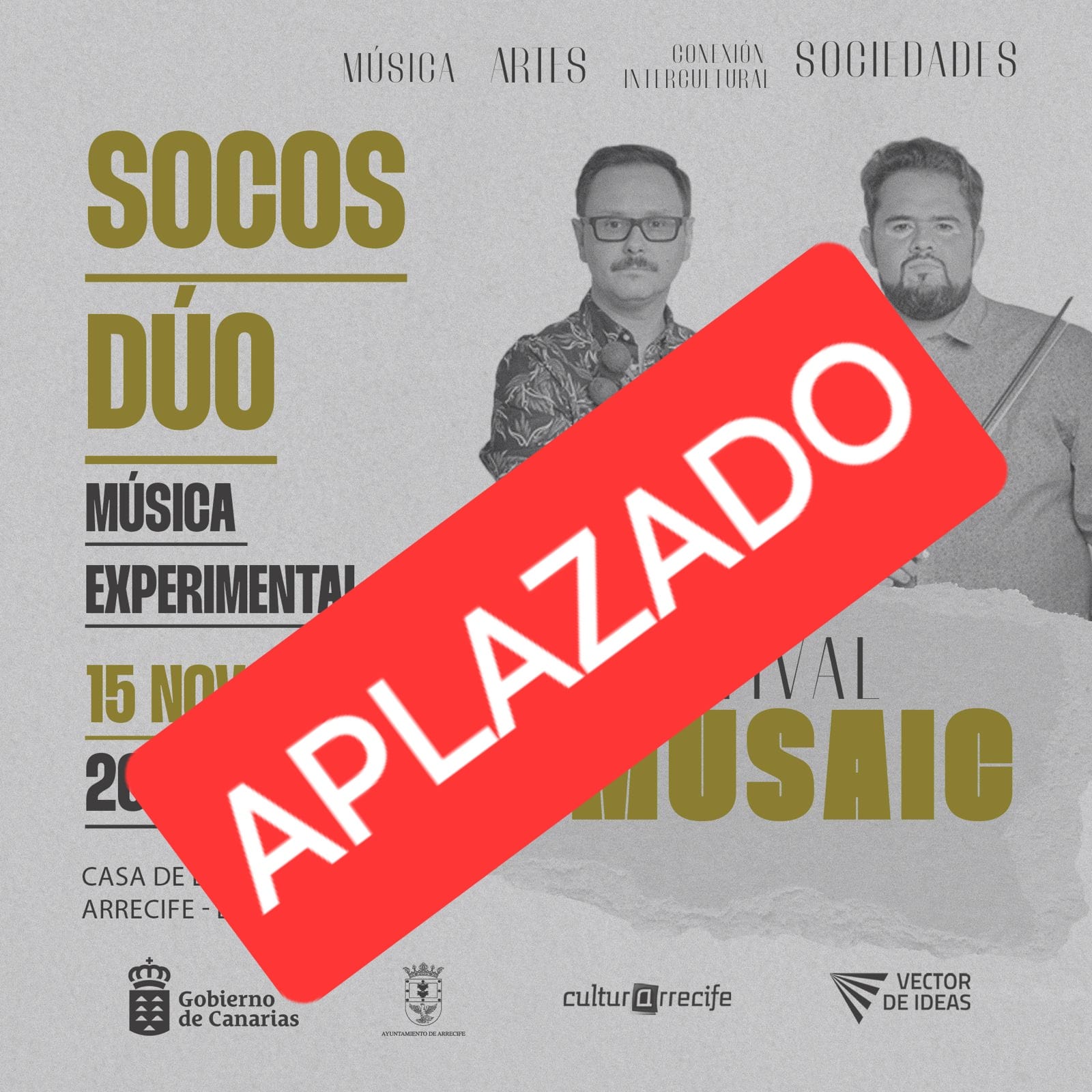 Debido a problemas técnicos ocasionados por la lluvia, nos vemos obligados a aplazar el concierto de 'Socos Dúo', programado para hoy viernes 15 de noviembre a las 20.00 horas en la Casa de la Juventud de Arrecife, dentro del Festival Musaic.